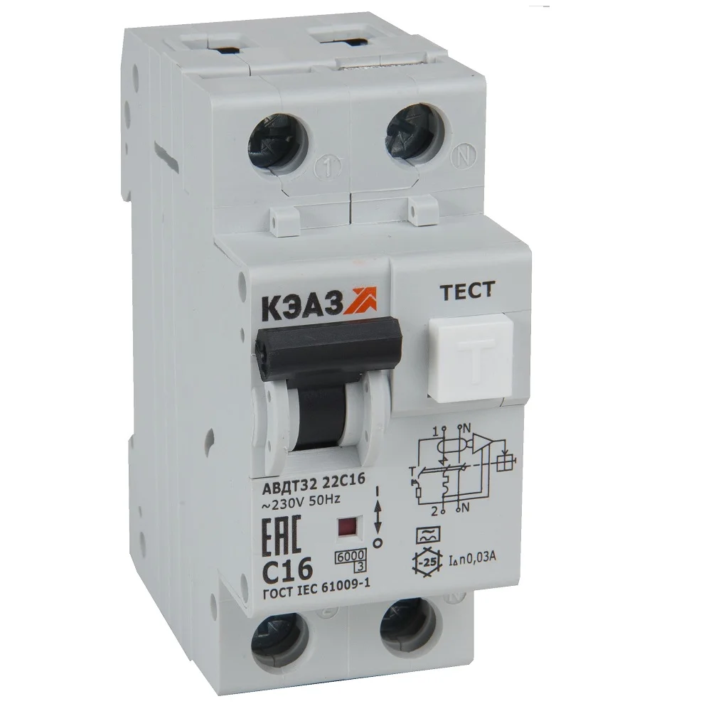 Автоматический выключатель дифференциального тока на номинальный ток 16 А и номинальный отключающий дифференциальный ток 30 мА.