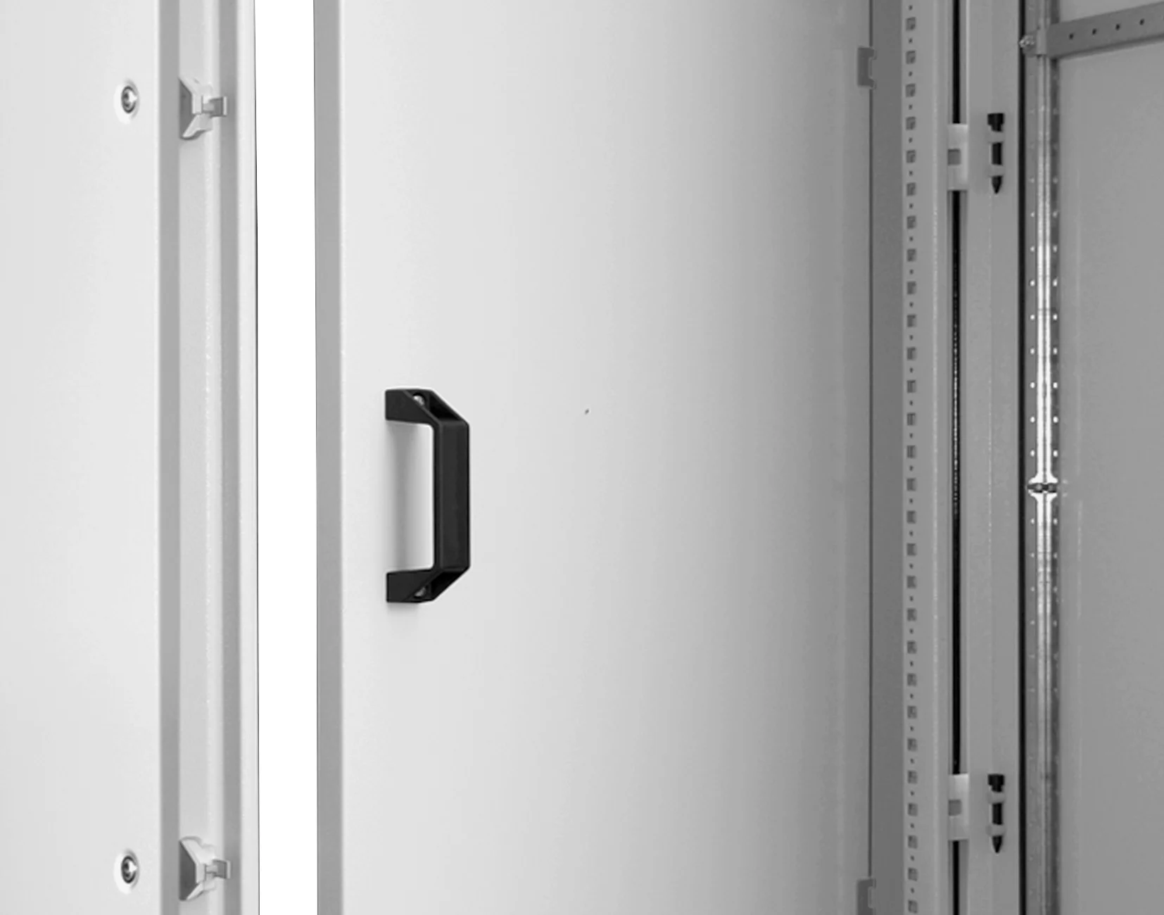 Реверсивная дверь с четырёхточечным штанговым замком и усиливающей рамой с отверстиями для крепления кабельных каналов, с углом открывания 225 гр. Предназначена для установки на фронтальную и/или тыльную часть рамы шкафов MPx. Идет в комплекте поставки стандартного шкафа MPS. Используется для компоновки шкафа индивидуальной сборки, также может быть заказана отдельной позицией.