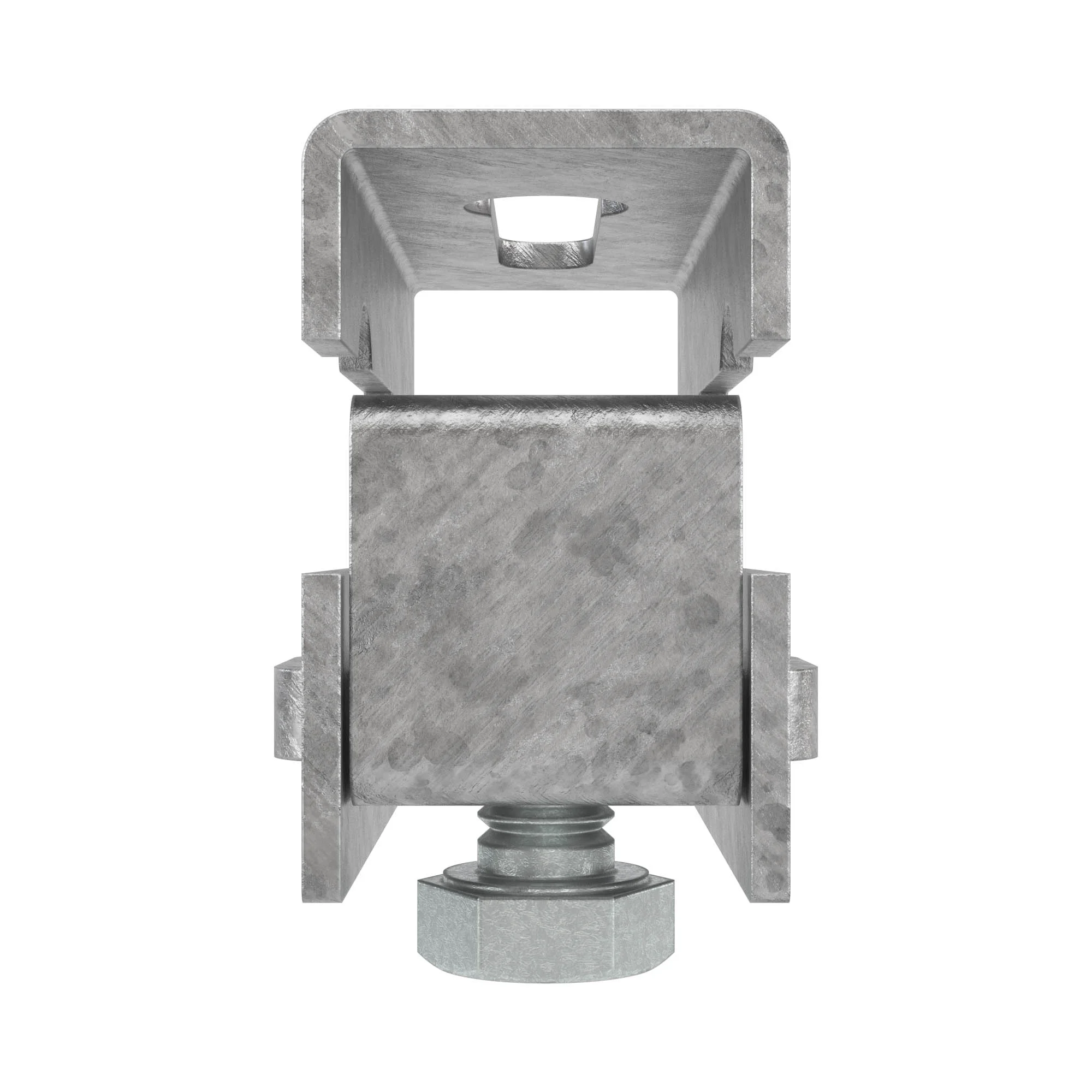Скоба-держатель полосы с болтом используется для крепления полосы шириной до 50 мм к фасаду и внутренним стенам. Материал — горячеоцинкованная сталь.