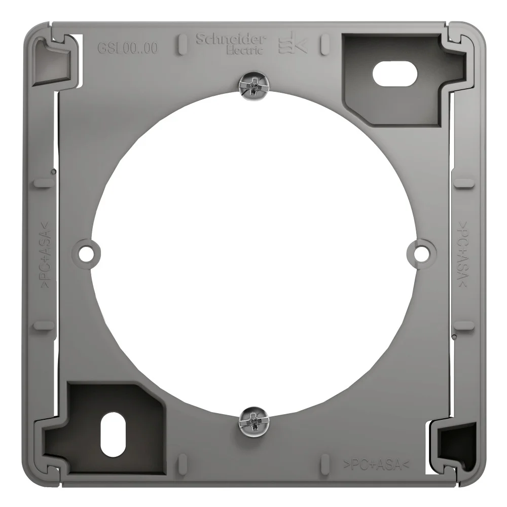 Коробка Systeme Electric (ранее Schneider Electric) серии Glossa (цвет графит) наружного монтажа. — Позволяет установить любую функцию скрытого монтажа на стену (как изделие открытого монтажа). — Выполнена из материала PС+ASA, стойкого к УФ-излучению и появлению царапин.