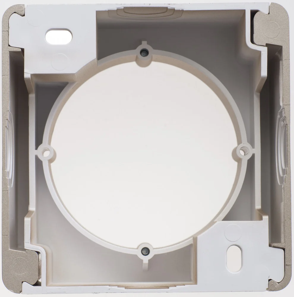 Коробка Systeme Electric (ранее Schneider Electric) серии Glossa (цвет перламутр) наружного монтажа. — Позволяет установить любую функцию скрытого монтажа на стену (как изделие открытого монтажа). — Выполнена из материала PС+ASA, стойкого к УФ-излучению и появлению царапин.