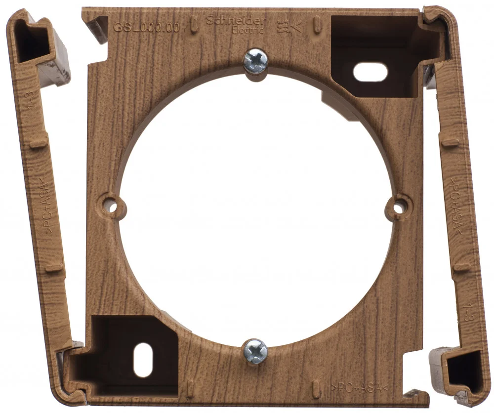 Коробка Systeme Electric (ранее Schneider Electric) серии Glossa (цвет дерево дуб) наружного монтажа. — Позволяет установить любую функцию скрытого монтажа на стену (как изделие открытого монтажа). — Выполнена из материала PС+ASA, стойкого к УФ-излучению и появлению царапин.