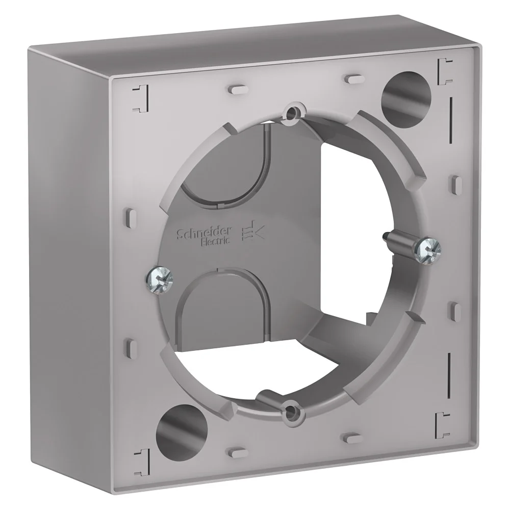 Коробка наружного монтажа Systeme Electric (ранее Schneider Electric) серии AtlasDesign в цвете алюминий. — Позволяет установить любую функцию скрытого монтажа на стену (как изделие открытого монтажа). — Благодаря специальным соединителям, входящим в комплект изделия, несколько коробок можно соединить между собой. — Лицевые детали из качественного ABS-пластика, устойчивого к царапинам и УФ-излучению.