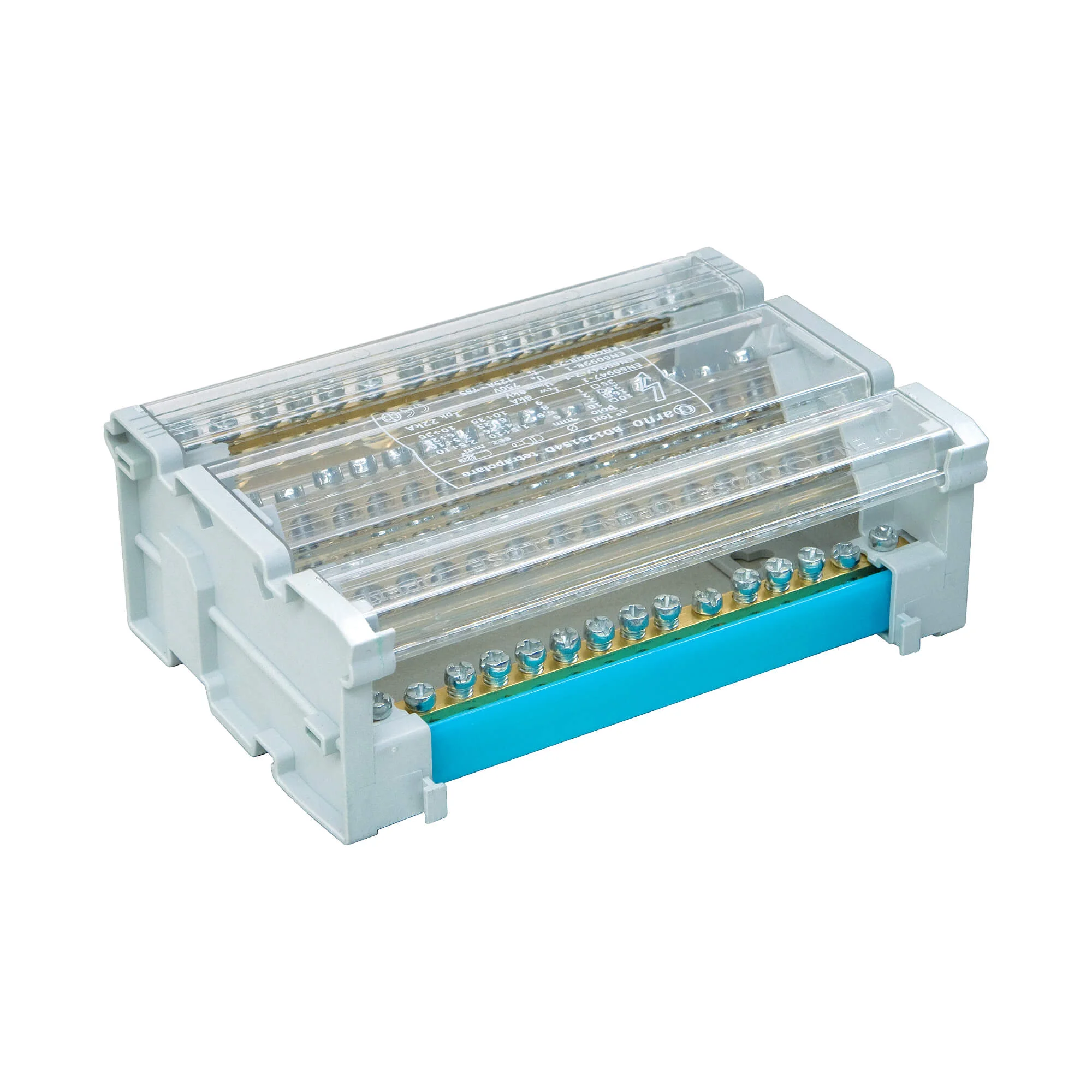 Предназначен для структурированного подключения отводных линий, разведения входящего проводника на несколько потребителей или участков. Позволяет создать упорядоченные системы распределения в электрощитах. Корпус блока выполнен из не поддерживающего горение полиамида PA6.6 и 4-х токоведущих шин в блоках 125 А, представляющие собой бруски из латуни с 15-ю отверстиями, в которые вставляются провода и зажимаются винтом. Избежать случайного […]