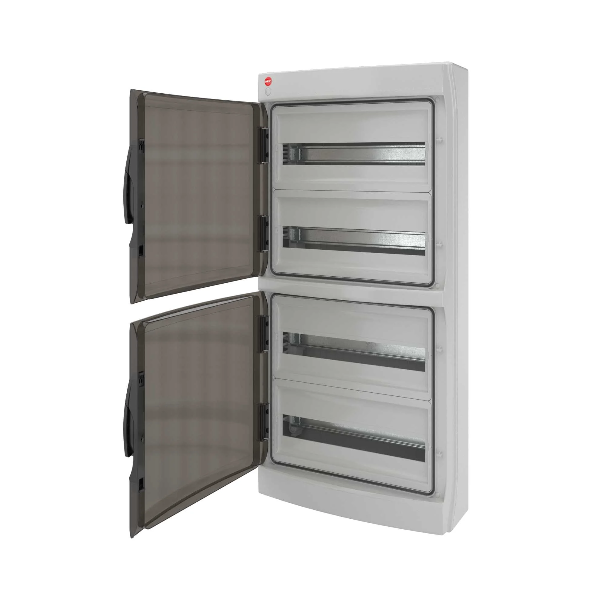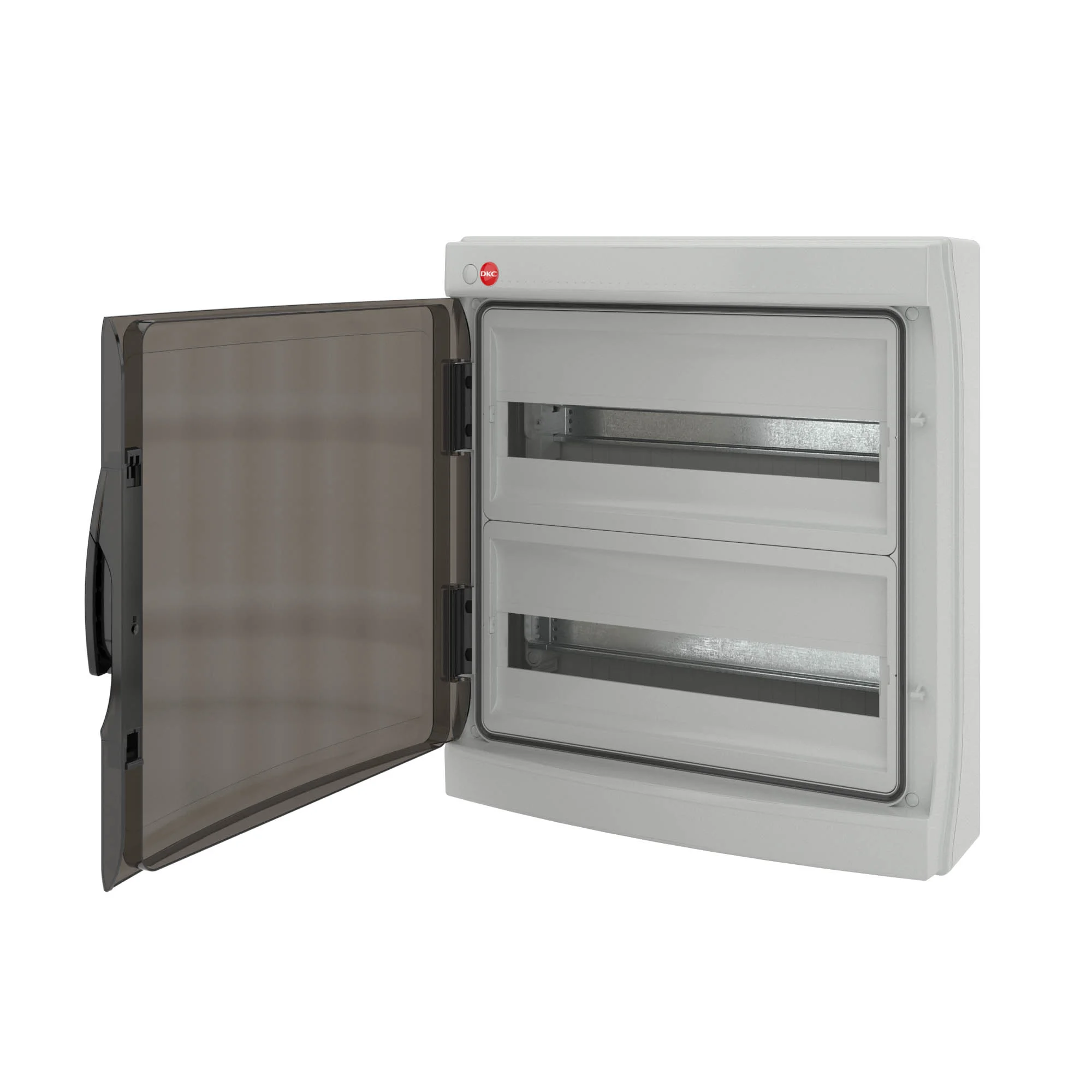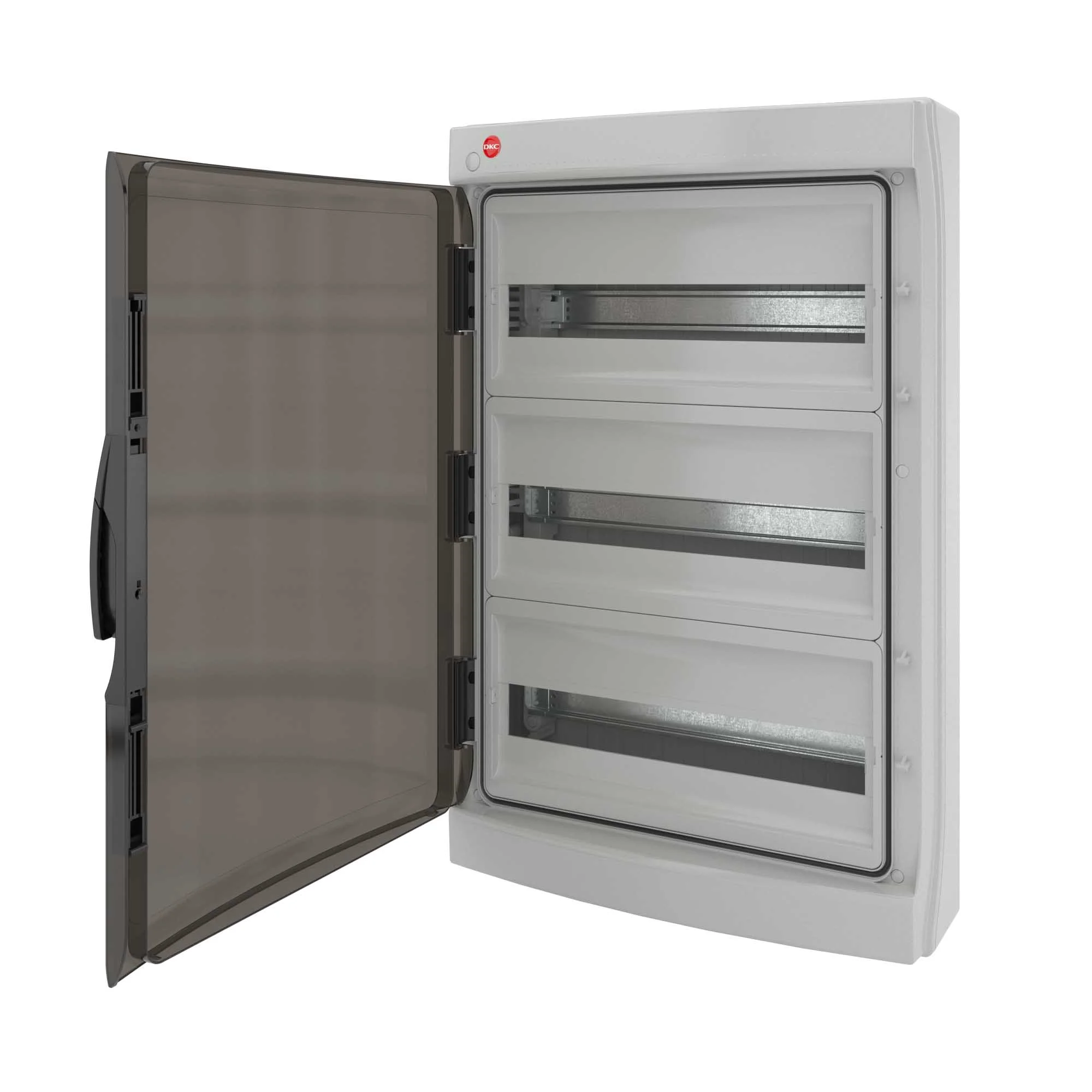 DKC FRAME Щиток 36 мод настенный , белый, с тонированной дверцей, с 4-мя шинами PEN (2шт на 8 отв. и
