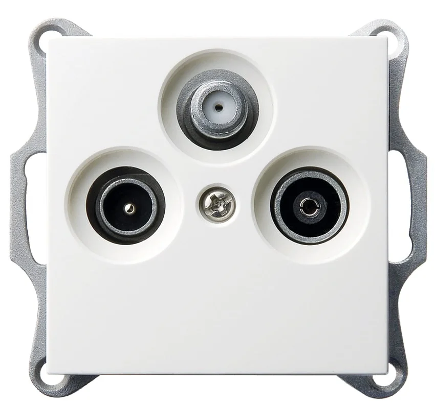 Розетка TV-FM-SAT. Назначение: для монтажа в подрозеточные коробки глубиной не менее 45 мм (код 59301);. Предназначена для подключения телевизионного, спутникового телевизионного и радио- кабеля к телевизору. Характеристики: винтовые зажимы; диапазон рабочих частот 4–2400 МГц; затухание
