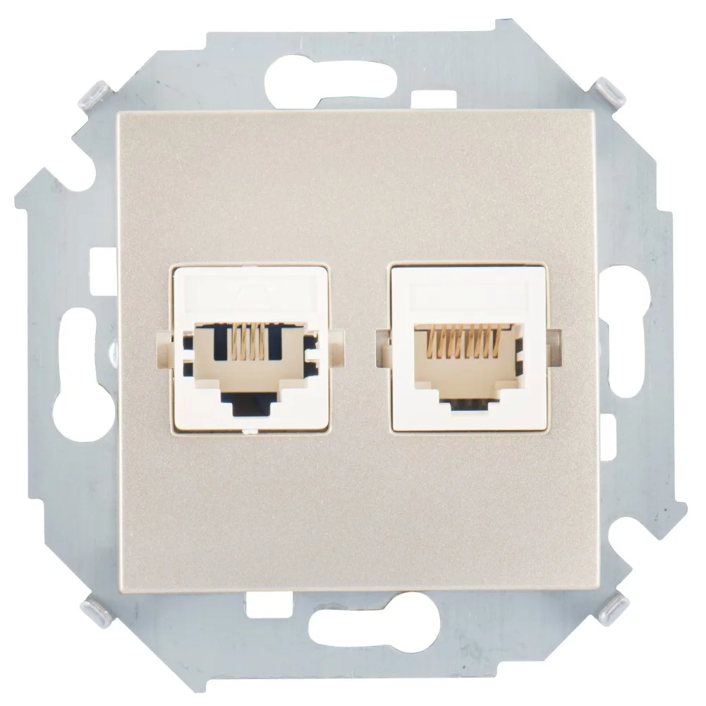 Механизм компьютерной розетки на 2 поста 6-й категории. Цвет — золотой. Без фронтальной рамки. Уровень пылевлагозащиты IP20. Тип подключаемого разъема — RJ45. Розетка устанавливается в стандартный круглый подрозетник. Габаритные размеры: длина 71 мм, ширина 71 мм, высота 42 мм. Гарантийный срок 10 лет.