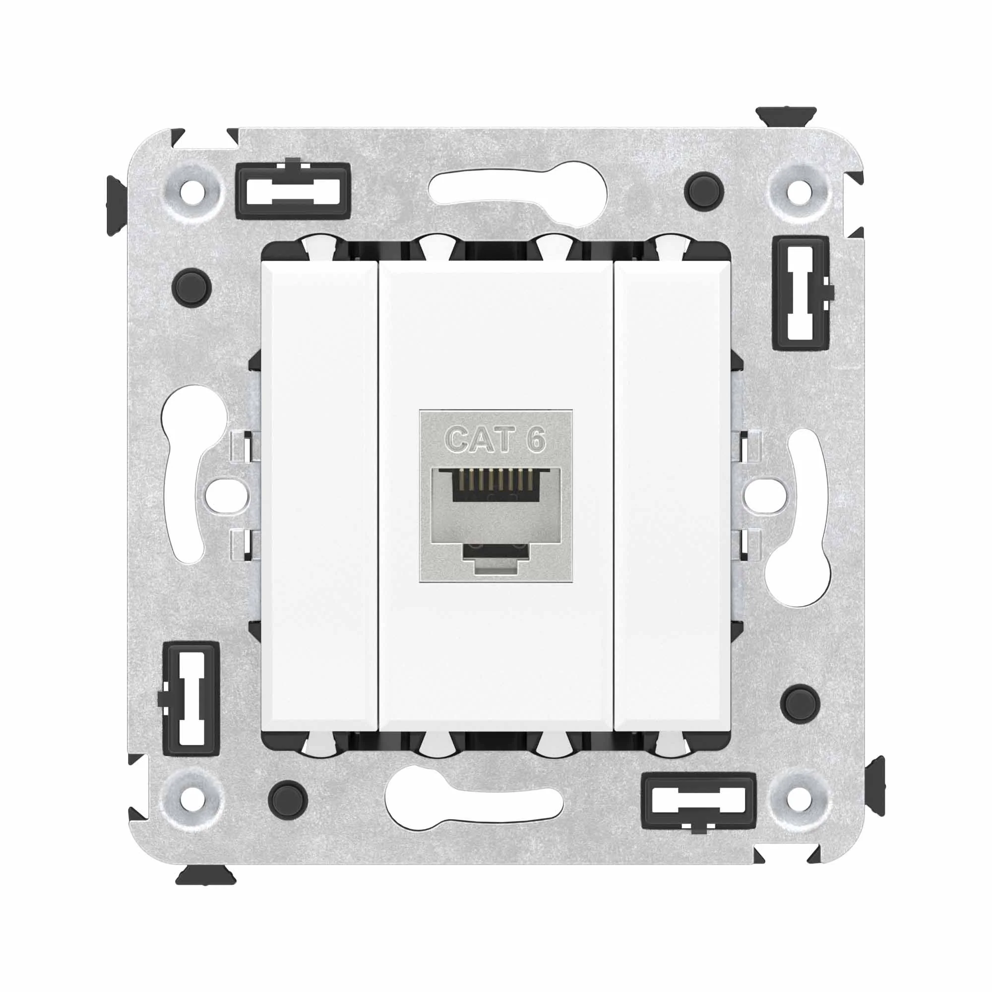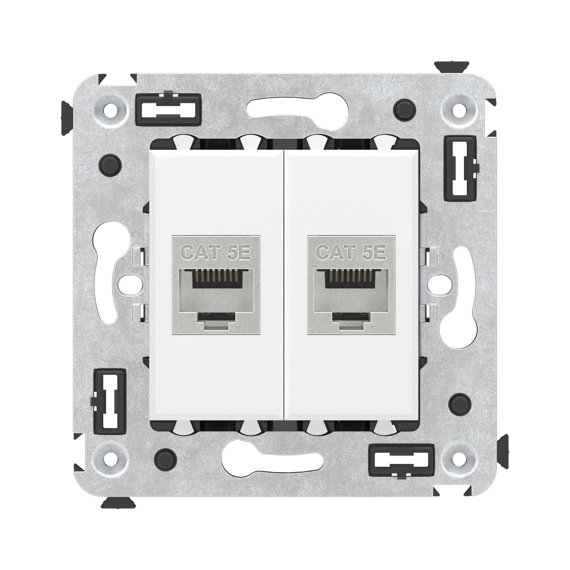 Механизм компьютерной розетки на 2 поста 6-й категории. Цвет — белый. Без фронтальной рамки. Уровень пылевлагозащиты IP20. Тип подключаемого разъема — Rj45. Розетка устанавливается в стандартный круглый подрозетник. Габаритные размеры: длина 71 мм, ширина 71 мм, высота 42 мм. Гарантийный срок 10 лет.
