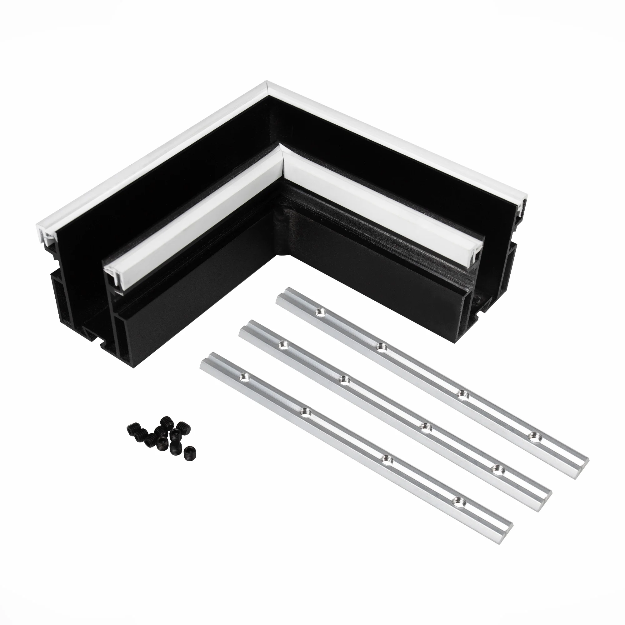 Угловой коннектор для встраиваемого трека MAG-ORIENT. Материал алюминий, цвет черный. Размеры 67x67x26x53мм. Аксессуары для соединения с треком приобретаются отдельно.