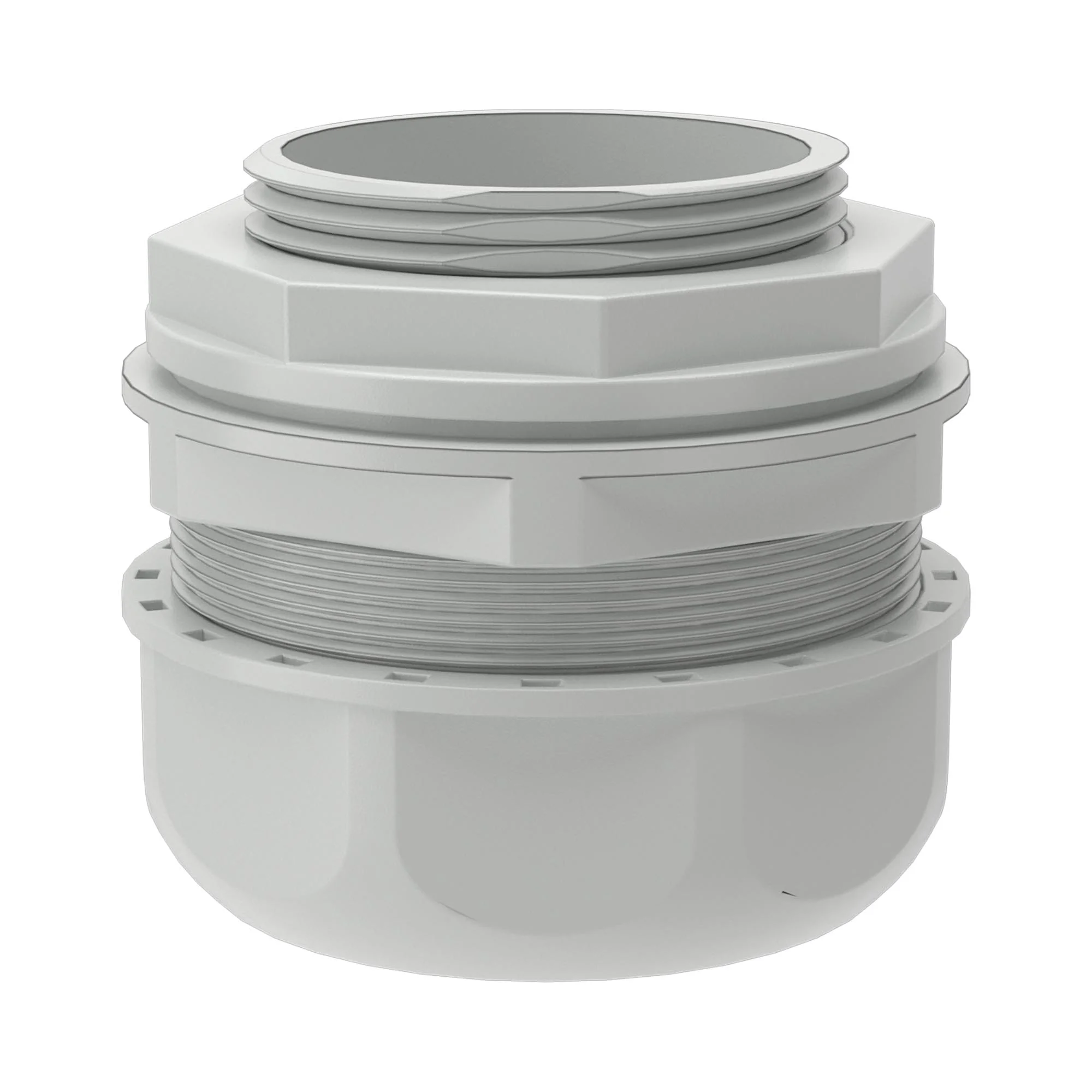 Муфта «труба-коробка» предназначена для герметичного соединения жестких гладких труб с корпусами ответвительных коробок, шкафов и щитков. Диаметр — 40 мм. Материал: полипропилен, резина. Цвет: серый, RAL 7035. Степень пыле- и влагозащиты IP67. Элемент системы может эксплуатироваться при широком диапазоне температур: от –40°С до +60 °С.