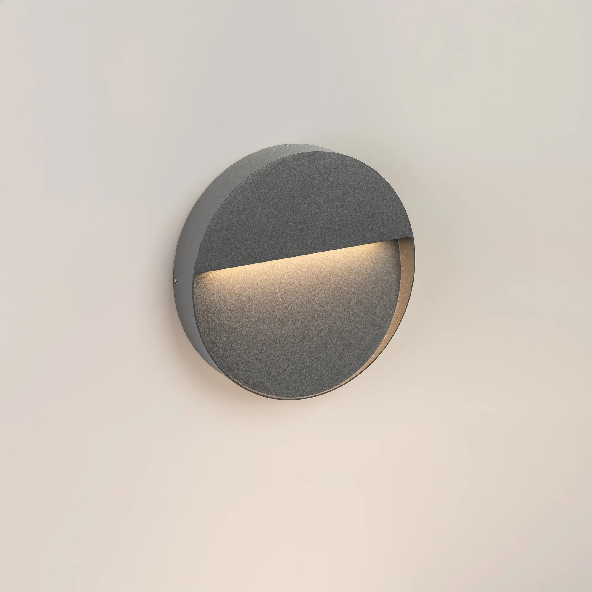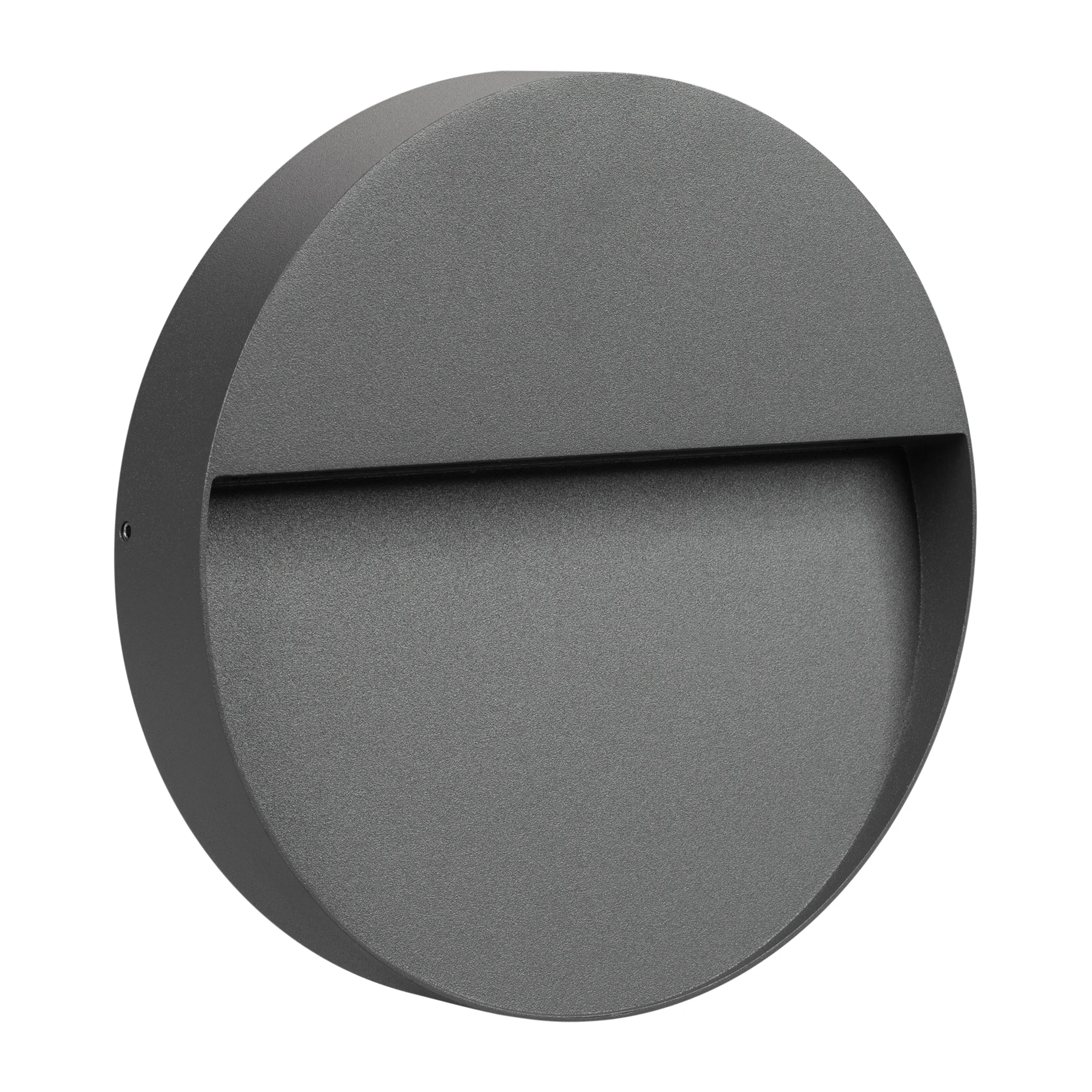Светодиодный накладной круглый светильник для стен, лестниц, 8Вт. Цвет ТЕПЛЫЙ БЕЛЫЙ 3000K, св.поток 300лм, CRI(Ra)>80, угол 60°, асимметричный свет. Размер Ф215×36мм. Влагозащищенный корпус IP65, алюминий серого цвета. Питание AC230V, 8Вт, встроенный драйвер.