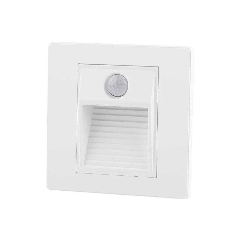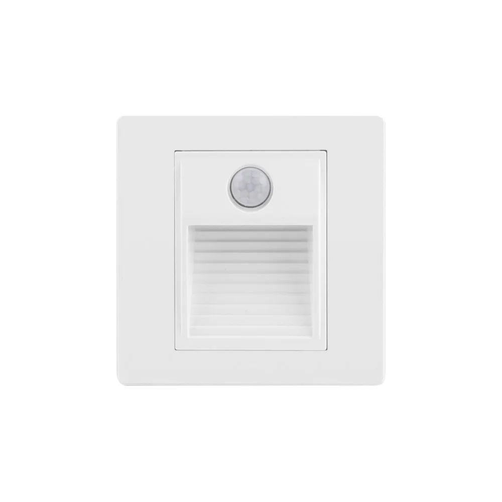 Светодиодный встраиваемый квадратный светильник для стен, лестниц, 3Вт. Цвет ТЕПЛЫЙ 3000К, световой поток 120лм, угол 30°, CRI>80. Влагозащищенный корпус IP65, белый алюминий. Питание AC230V, мощность 3Вт. Размеры LxWxH 70x70x97мм (закладная часть Ø62×95мм).