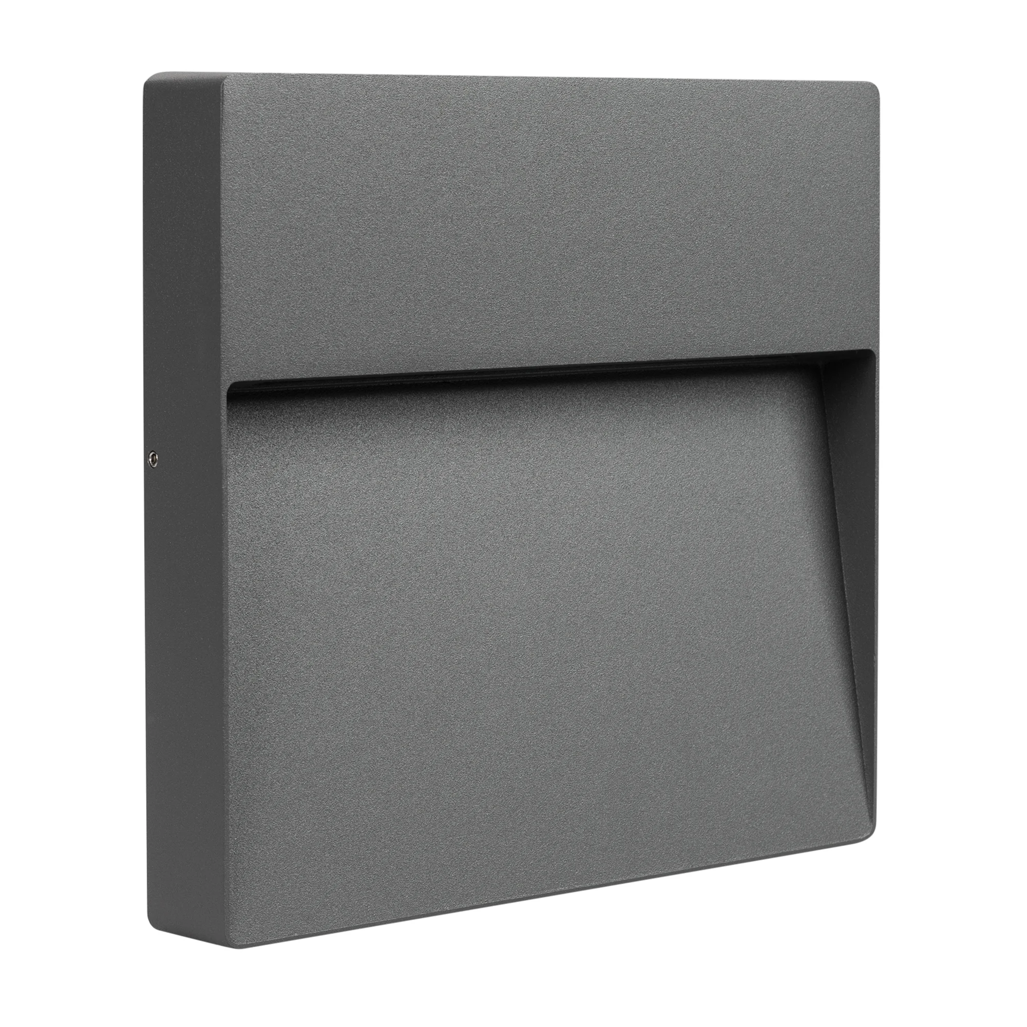 Светодиодный накладной квадратный светильник для стен, лестниц, 8Вт. Цвет ТЕПЛЫЙ БЕЛЫЙ 3000K, св.поток 300лм, CRI(Ra)>80, угол 60°, асимметричный свет. Размер 215x215x36мм. Влагозащищенный корпус IP65, алюминий серого цвета. Питание AC230V, 8Вт, встроенный драйвер.