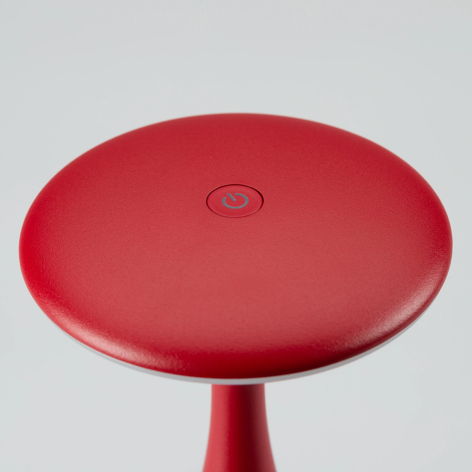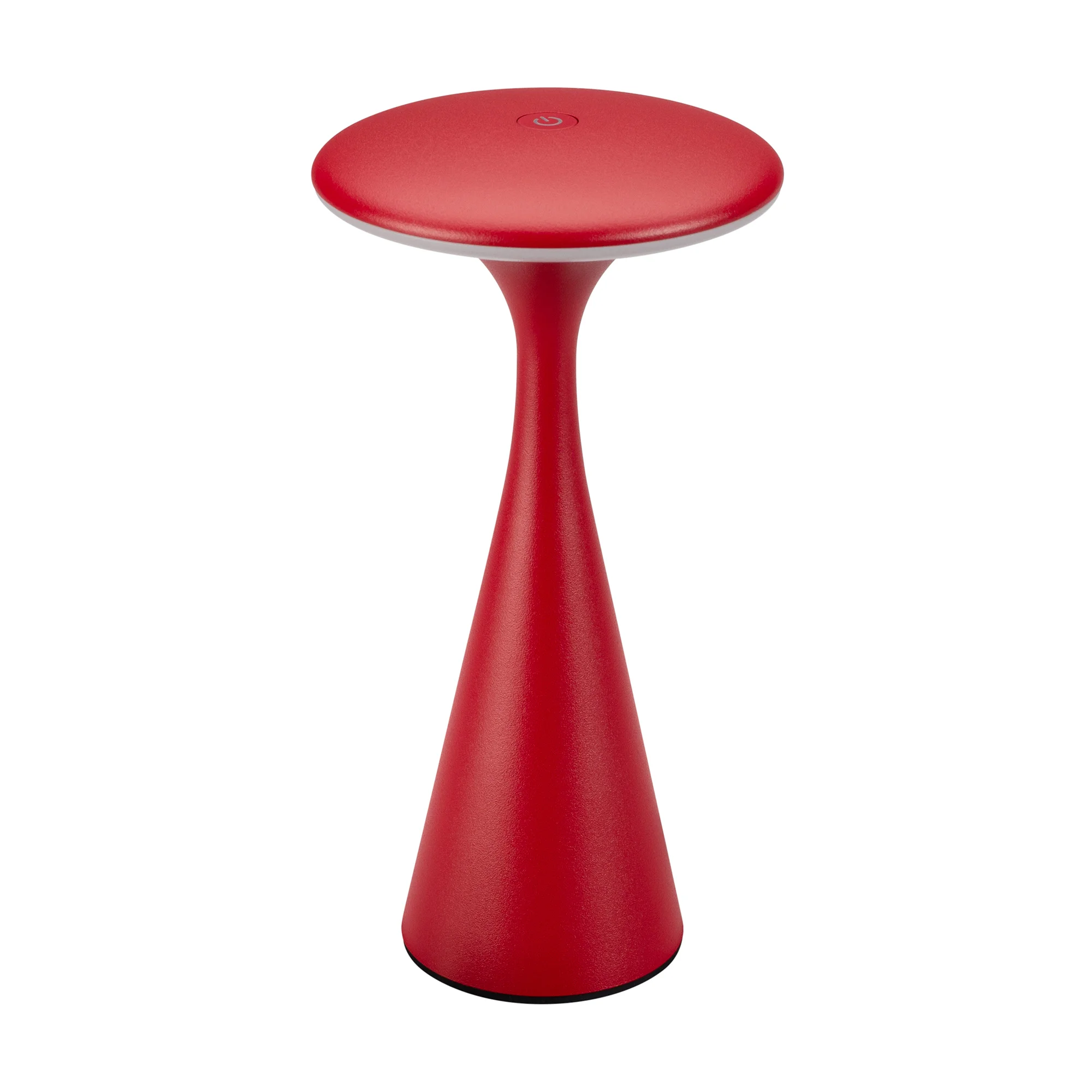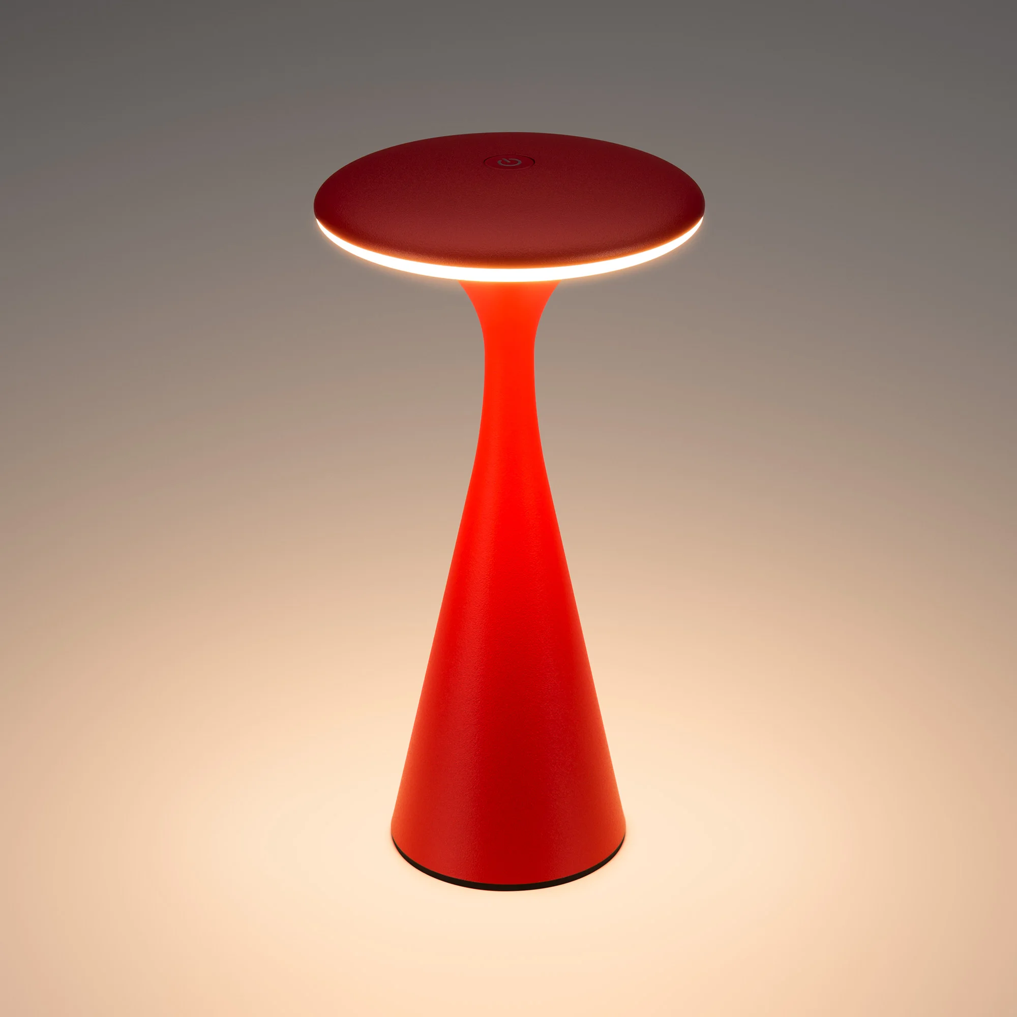 Настольный светильник со встроенным аккумулятором 1.5Вт, красный алюминиевый корпус. Цвет ТЕПЛЫЙ БЕЛЫЙ 2200-3000K, св.поток 110лм, CRI(Ra)>80, угол 123°. Размер Ф101×197мм. IP54. Зарядка от сети переменного тока AC220-240V. Тип встроенного аккумулятора 2600мАч Li-ion, напряжение батареи 3.7V