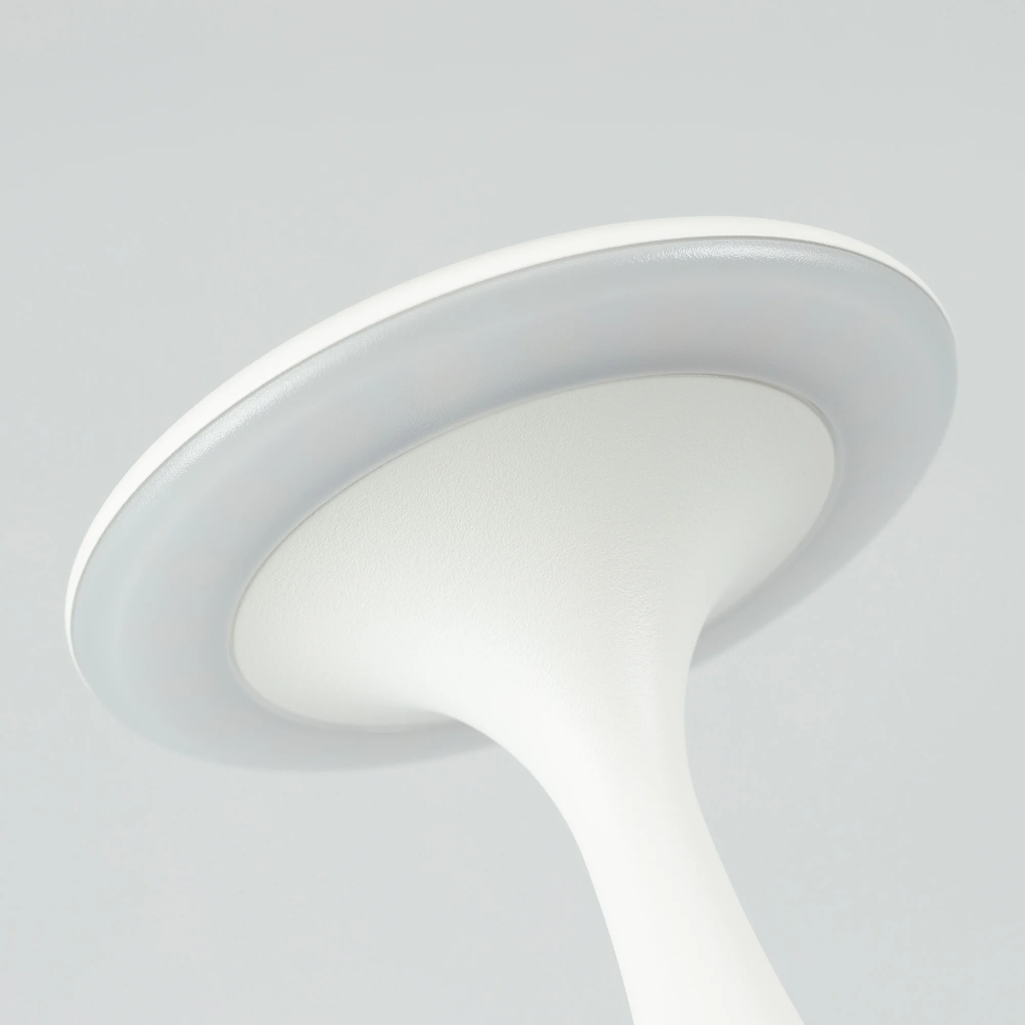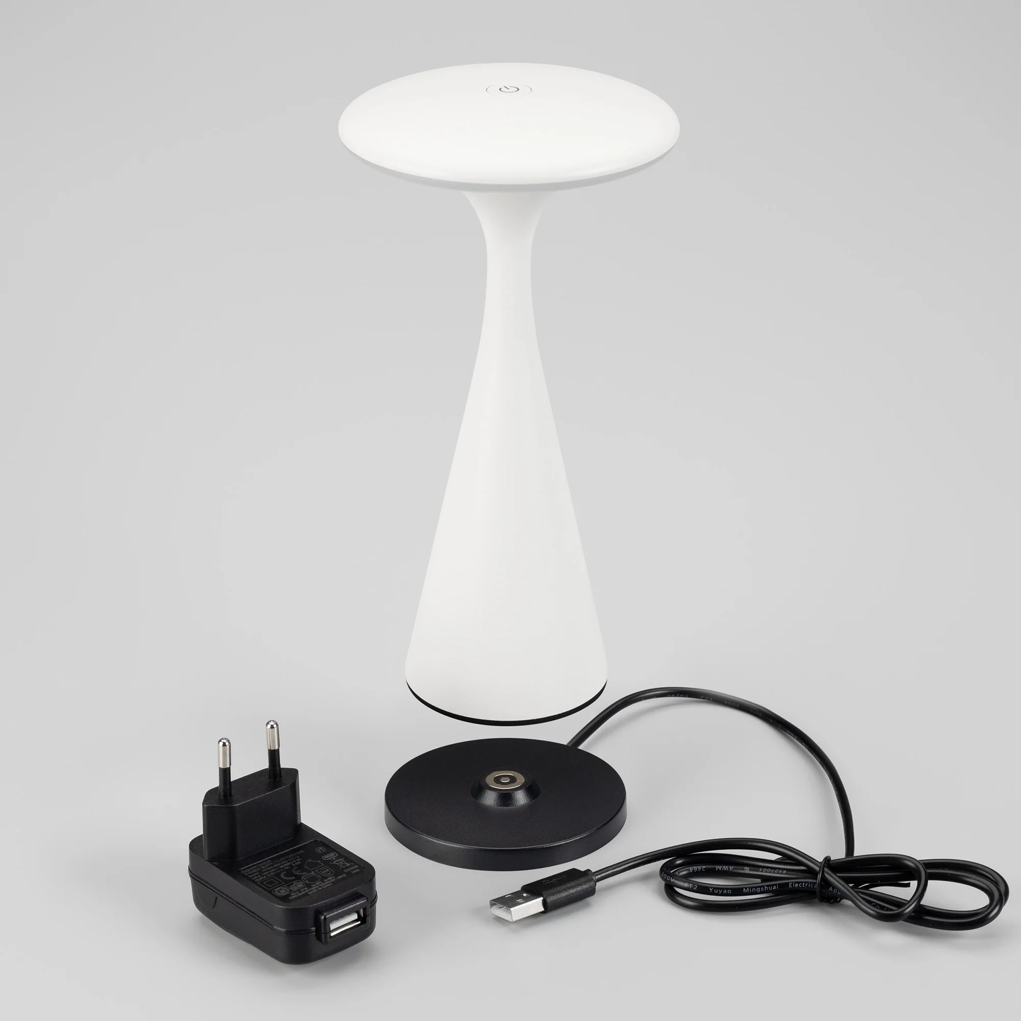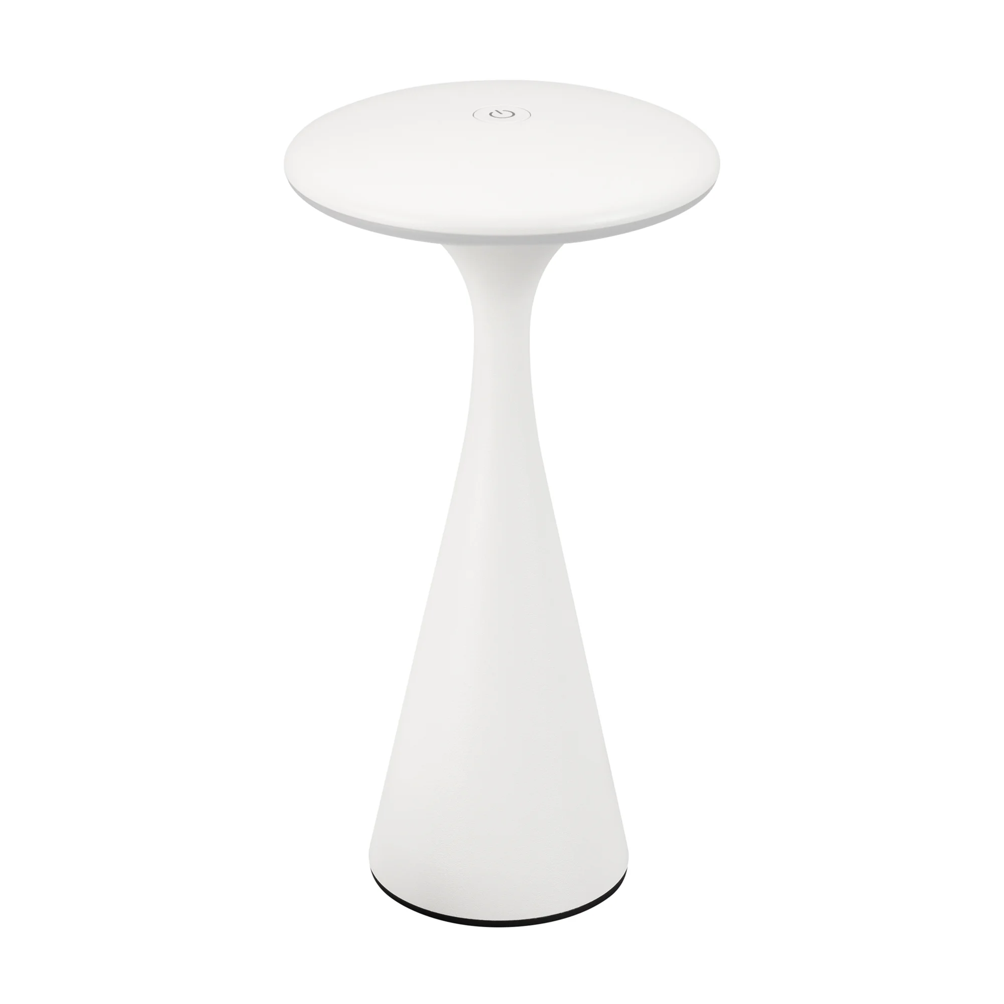Настольный светильник со встроенным аккумулятором 1.5Вт, белый алюминиевый корпус. Цвет ТЕПЛЫЙ БЕЛЫЙ 2200-3000K, св.поток 110лм, CRI(Ra)>80, угол 123°. Размер Ф101×197мм. IP54. Зарядка от сети переменного тока AC220-240V. Тип встроенного аккумулятора 2600мАч Li-ion, напряжение батареи 3.7V