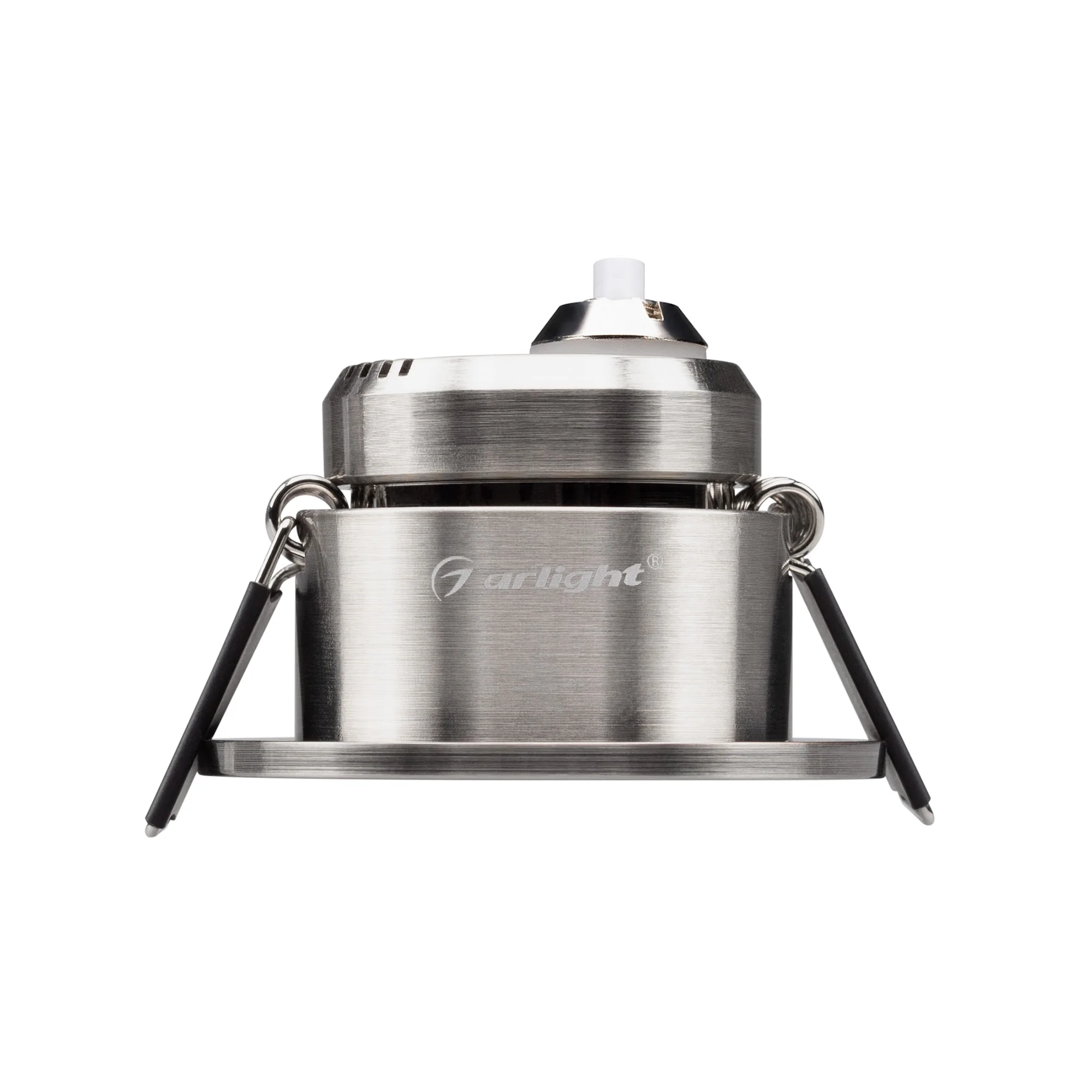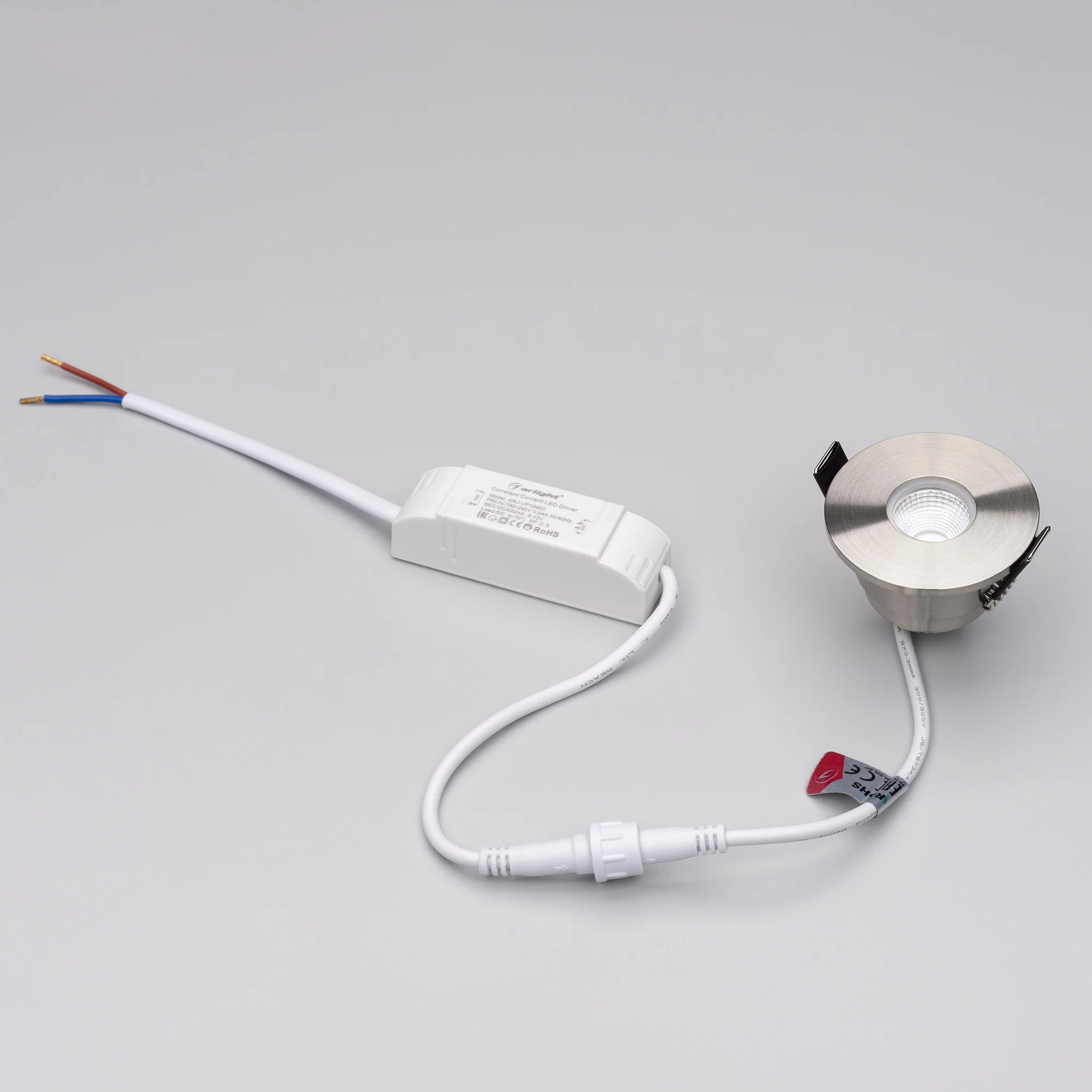 Встраиваемый светильник даунлайт. Мощность 5 Вт, св. поток 400 лм, 80 лм/Вт, дневной 4000 K, CRI>90, угол 60°, напряжение питания 230 В. Цвет Никель, круглый корпус из алюминия, экран PMMA, степень защиты IP54. Размер: диаметр 54 мм, высота 30 мм. Монтаж встраиваемый, установочное отверстие: диаметр 45 мм. Драйвер IP54, 8-12 В, 400 мА, пульсация <2%.