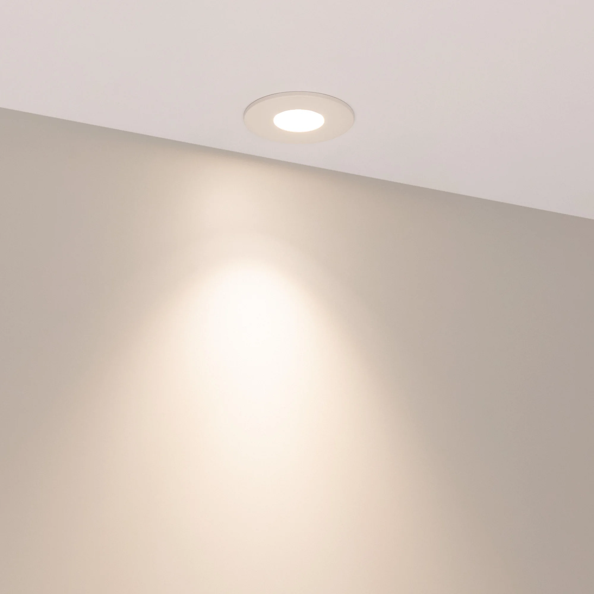 Встраиваемый светильник даунлайт. Мощность 5 Вт, св. поток 400 лм, 80 лм/Вт, теплый 3000 K, CRI>90, угол 60°, напряжение питания 230 В. Белый круглый корпус из алюминия, экран PMMA, степень защиты IP54. Размер: диаметр 54 мм, высота 30 мм. Монтаж встраиваемый, установочное отверстие: диаметр 45 мм. Драйвер IP54, 8-12 В, 400 мА, пульсация <2%.