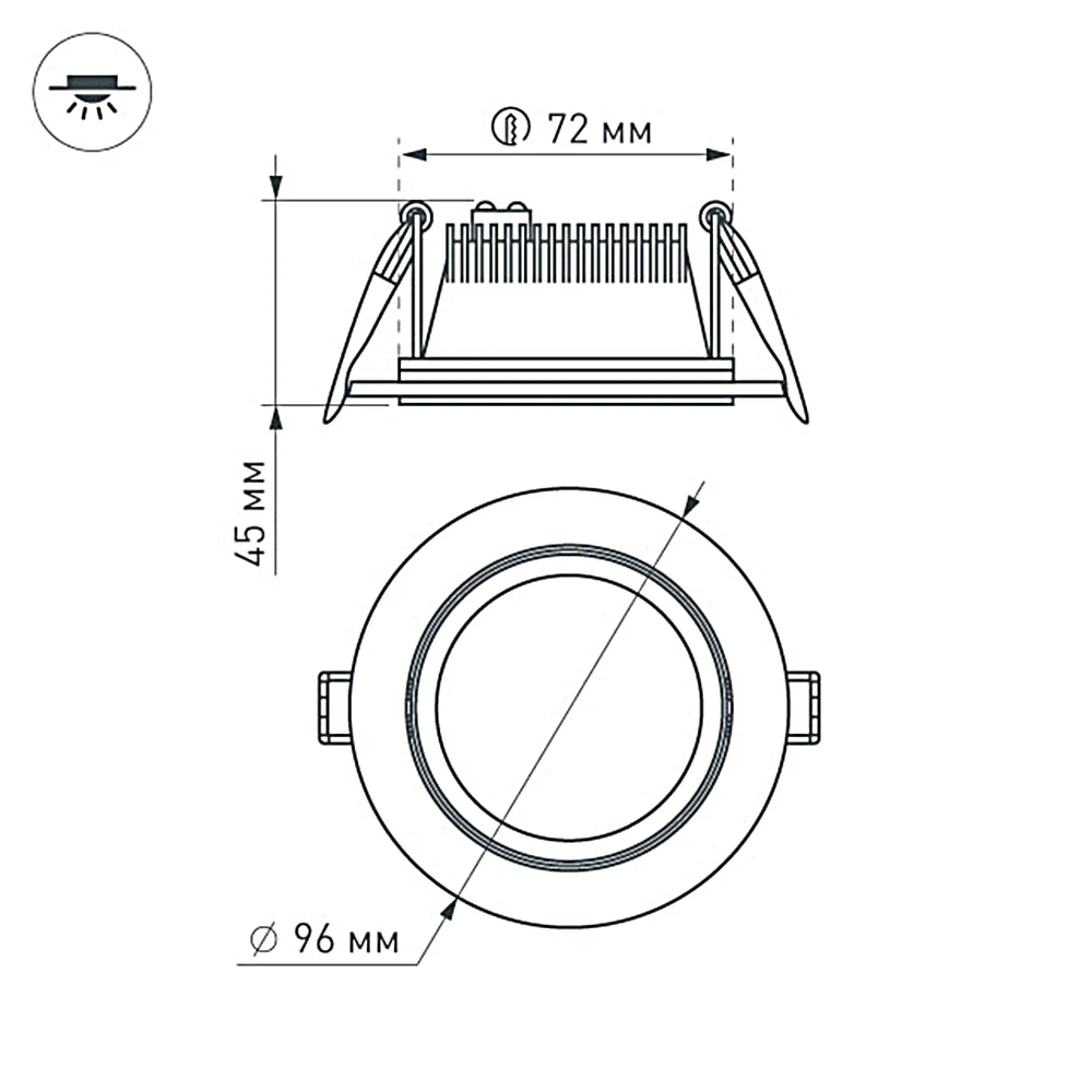 Встраиваемый круглый светильник, угол 110° / 9Вт / ДНЕВНОЙ БЕЛЫЙ 4000K / светодиод 1x9W / 810лм, CRI>80. Белая лицевая панель. IP44. Питание AC180-240V, 9Вт, 220mA 37-45V, драйвер в комплекте. Размеры DxH: 105х55мм, отверстие для установки 95мм.