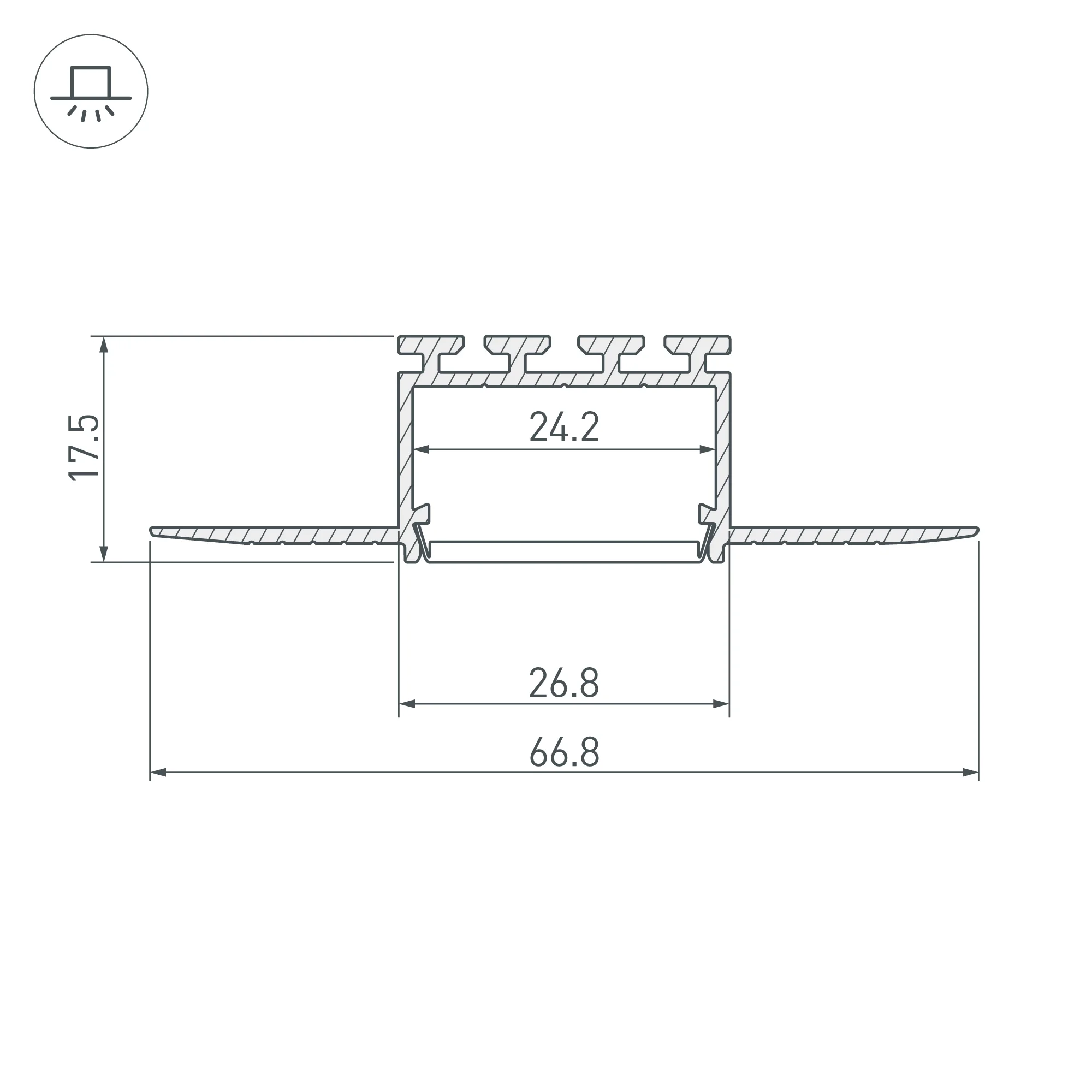 Алюминиевый профиль для светодиодных лент и линеек. Встраиваемый в гипсокартон толщиной 16 мм, под строительную отделку. Позволяет создать линию света шириной 24 мм. без видимых частей алюминия. Габаритные размеры (L×W×H): 2000x67x18 мм. Ширина площадки для ленты 24 мм. Экраны, заглушки и другие аксессуары приобретаются отдельно. Цена за 1 метр. Кратность заказа поставщику: 2 м.