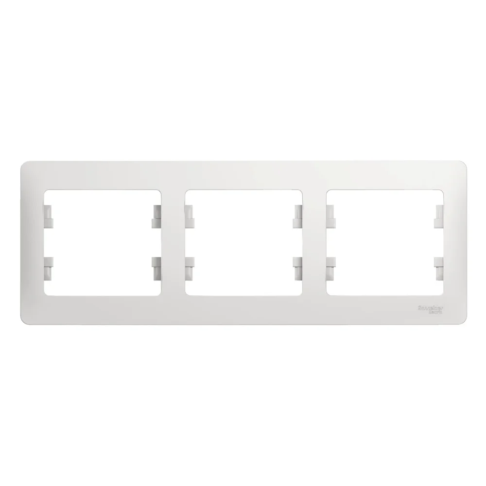 Рамка Systeme Electric (ранее Schneider Electric) серии Glossa (цвет белый) трёхместная. — Устанавливается в горизонтальном положении. — Выполнена из материала PС+ASA, стойкого к УФ-излучению и появлению царапин. — Позволяет гармонично вписать электроустановочное изделие в интерьер помещения.
